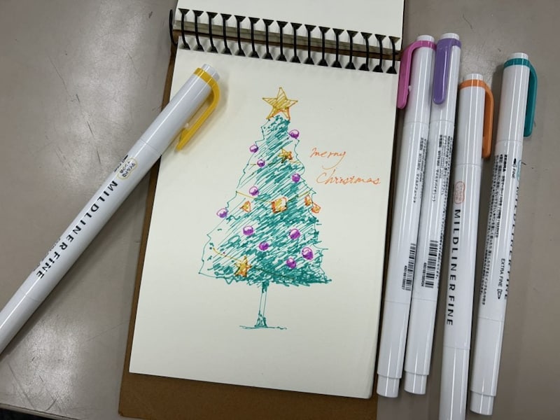 さて『マイルドライナーファイン』を、プロ画家の小林聡一先生に試していただきました。使用したのは『マイルドライナーファイン』Bセット。このセットを使って、温かみのあるクリスマスイラストを描いていただきました。