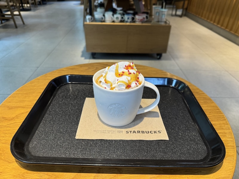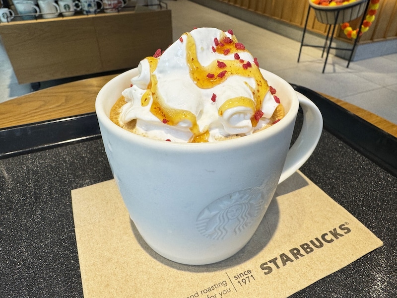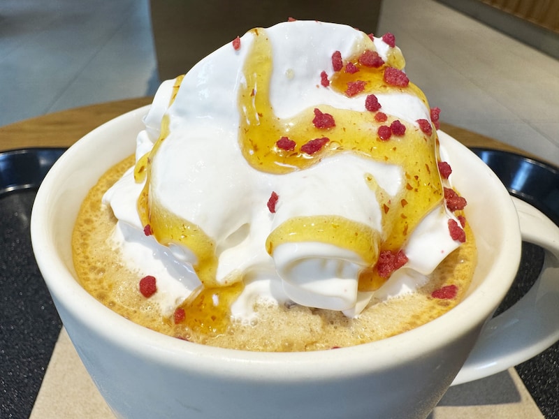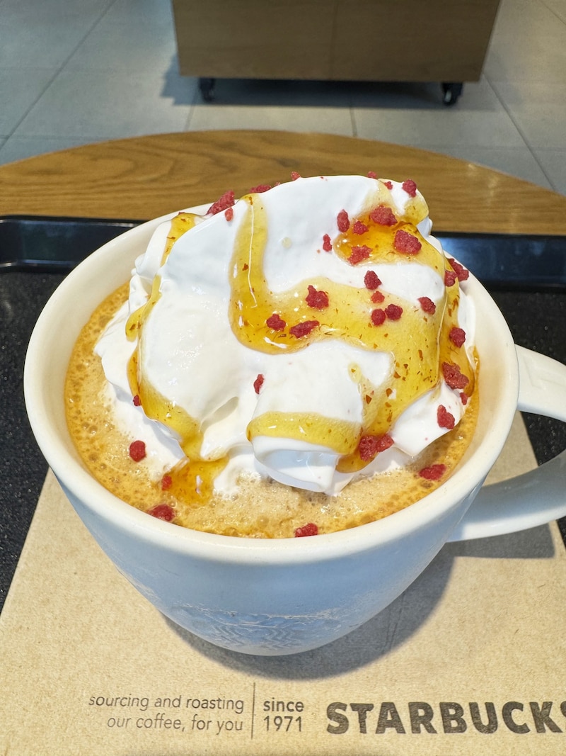 温かいビバレッジですが、ストローが付いてきました。熱すぎないのでストローで飲んでも問題ありませんでした。むしろ、一気に極甘なテイストが流れ込んでくるのでイイ感じに癒やされます。