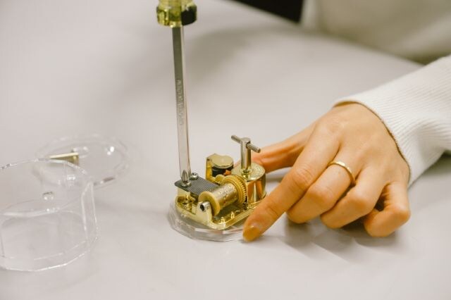 オルゴール職人のサポートのもと、自分だけの音色のオルゴール作りを体験できます。好みの曲、ケース、コース(一般コース、上級コース)を選んで、完成したオルゴールは持ち帰りできます。クリスマスらしい飾り付け小物(220円~)もスタンバイ。