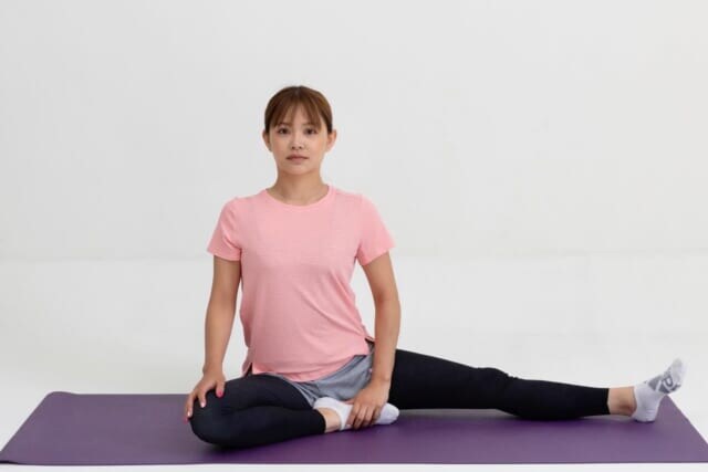 (1)床に座って左脚を体の横に伸ばし、右脚をひざを曲げたまま体の前に置く