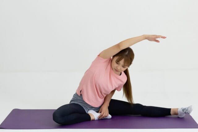 ▲上半身右側の側面が伸びているのを感じましょう。伸びが足りないなら、左手で伸ばしている左腕を引っ張ってあげると、より筋肉の伸びを感じることができます