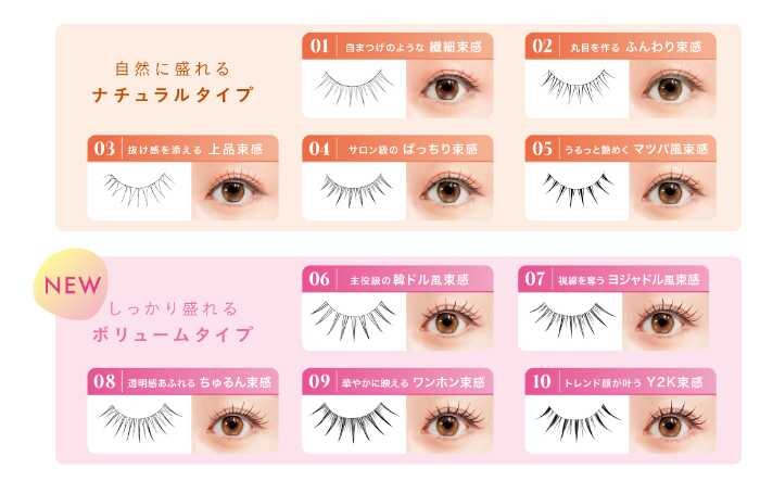 ナチュラル派に人気の第1弾(01〜05)と、盛り派にぴったりの第2弾(06〜10)を合わせた全10型のラインナップ。TPOやメイクのテイストに合わせて、自分らしいまつげスタイルを選べます。