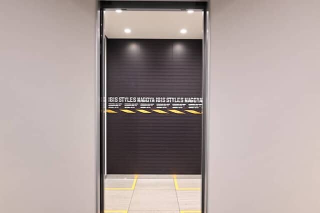 エレベーターのドアが開くと、奥がシャッターのようなデザインになっていて黒×黄色の “トラテープ(警戒テープ)” が描かれています。つい笑顔になるデザインが素敵です。