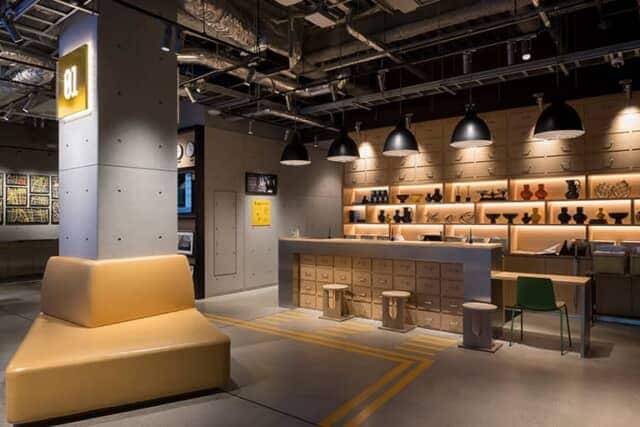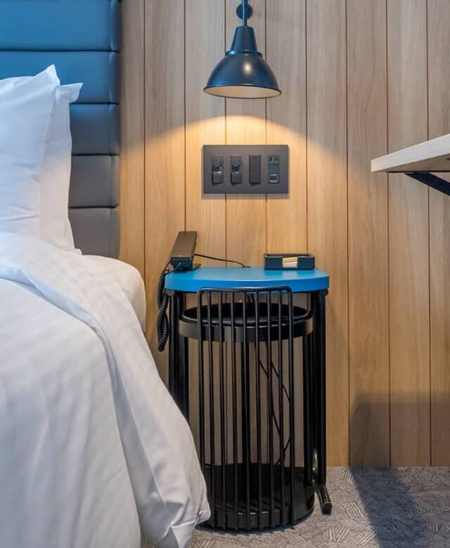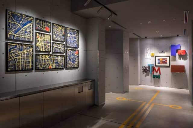 フロアナンバーや案内表示は穴の開いたメタルボードに表示され、市場や工場などのイメージをモダンにデザイン。階によって青か黄色のポップなアクセントカラーに色分けされ、客室のウォールアートやシャワーブースも青か黄色が使われています。