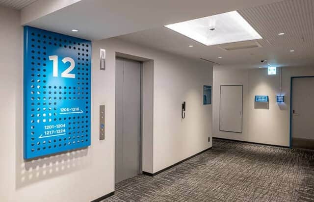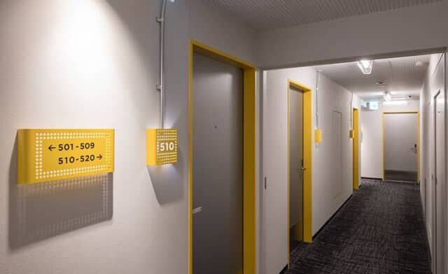 ルームナンバーやドア枠も階ごとに青か黄色で統一。明るい雰囲気になっています。