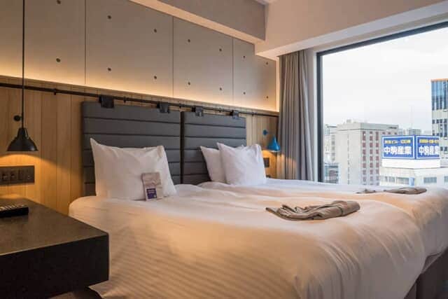 ツインルームには幅100cm × 長さ200cmのベッドが2台置かれます。