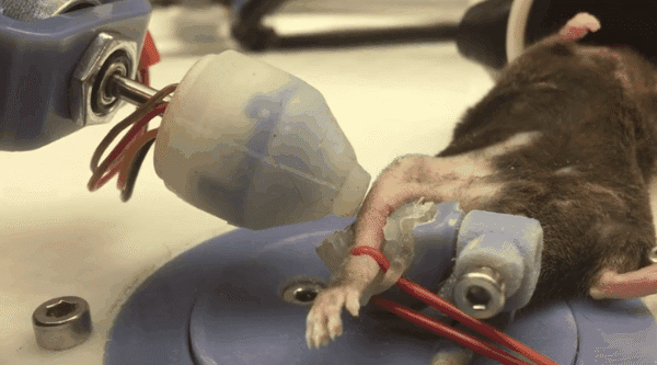 研究者たちはこの装置に、脚の筋肉を損傷させたマウスを設置(※マウスは薬で眠らされています)。
