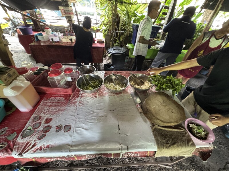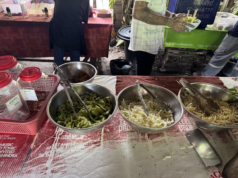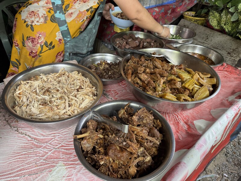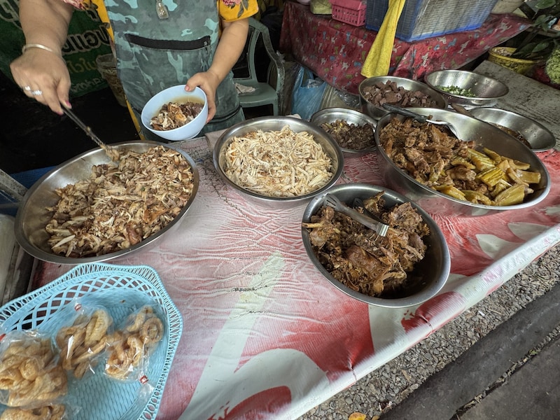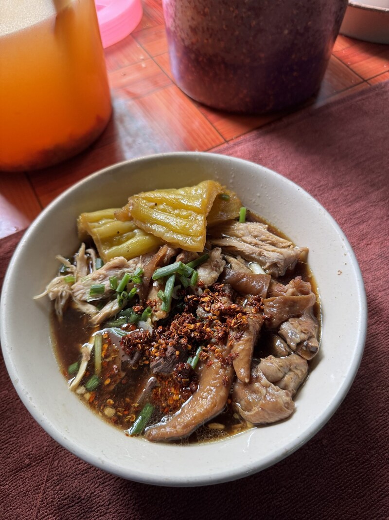 実際に食べてみました。今回は中華麺でオーダー。まずは女将さんが麺を茹でて、鶏出汁たっぷりのスープとともにチキンヌードルを丼に入れてくれます。あとは、客が自分でオカズ陳列テーブルに行って、丼に好きなだけオカズを盛って完成。