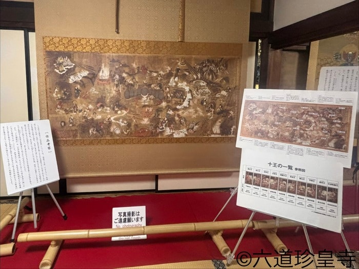 「珍皇寺参詣曼茶羅図」(複製)。こちらの本図に描かれているのは、中世におけるお盆(盂蘭盆)の精霊迎えの様子、「六道まいり」を表現したもので、見る箇所で、当時の参拝人や本堂を中心とした、閻魔堂の様子に、小野篁が冥土に通ったという古井戸も右上の角に描かれており、現世と冥界の境にあるとされた当寺でのこうした光景は、多くの人達に地獄世界を啓蒙するうえで大きな役割をはたしたと伝えられています。