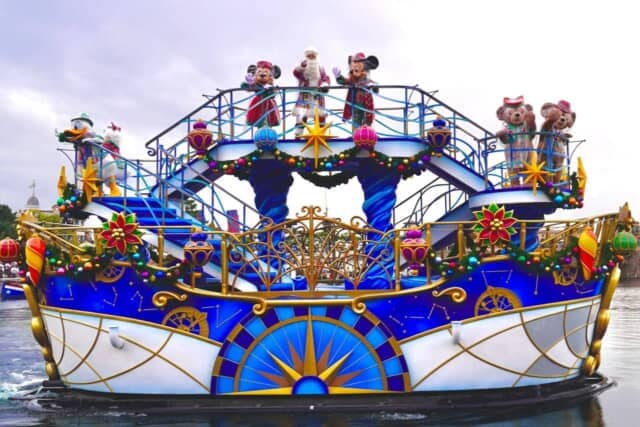ミッキーマウスやダッフィーたちが登場し、音楽に合わせてゲストにクリスマスのあいさつを届ける温かなミニショーです。