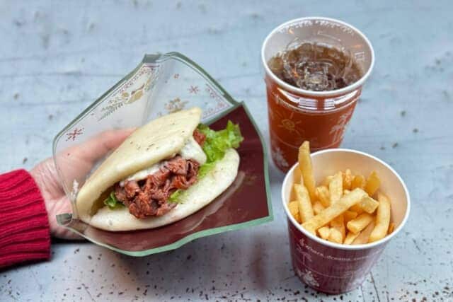 ローストビーフとポテトサラダを挟んだ贅沢サンドウィッチに、フライドポテトとストロベリー&ミルクゼリー、ドリンクが付いたボリューム満点のセットです。華やかな見た目と食べ応えのある内容は、大人ディズニーにもぴったり。