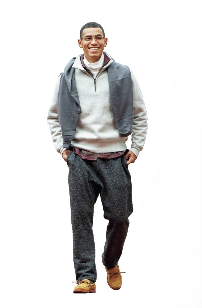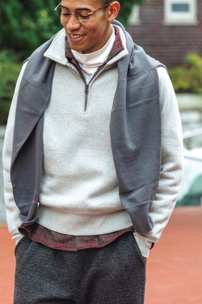 レイヤードのテクニックとして押さえておきたいのがスウェットシャツの肩掛け。ラフに肩から掛ければ一気にこなれ感が生まれる。カラースウェットも良いが、トップスと同系色を選ぶとより落ち着いた印象に。杢グレーとスミクロの組み合わせは、洗練されたグラデーションを生み出す。ハーフジップスウェット2万3100円、肩に掛けたスウェットシャツ1万1000円
