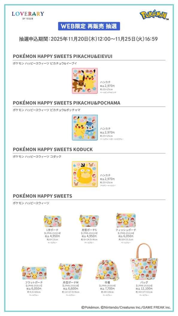 フェイラーの人気ギフトショップ「LOVERARY BY FEILER」から、心ときめくポケモンデザインシリーズ第2弾が、公式オンラインショップ限定の抽選販売で待望の再登場です♡今回が最後の販売となり、ファン必見のスペシャルなラインナップ。ピカチュウやイーブイ、ポッチャマ、コダックなど人気キャラクターとスウィーツを組み合わせたデザインは、眺めているだけでHappyな気分に。全10種類からお気に入りを見つけたい方は、ぜひ早めのチェックを。