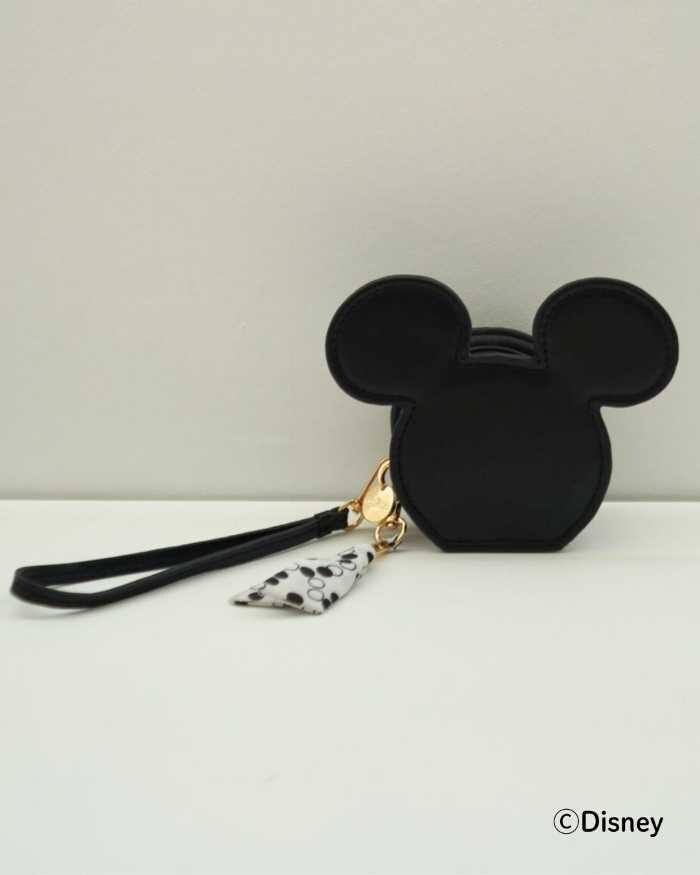 ミッキーマウスのシルエットデザイン。裏地にはキャラクタープリントを使用し、バッグチャームとしても使えるDカン付き。