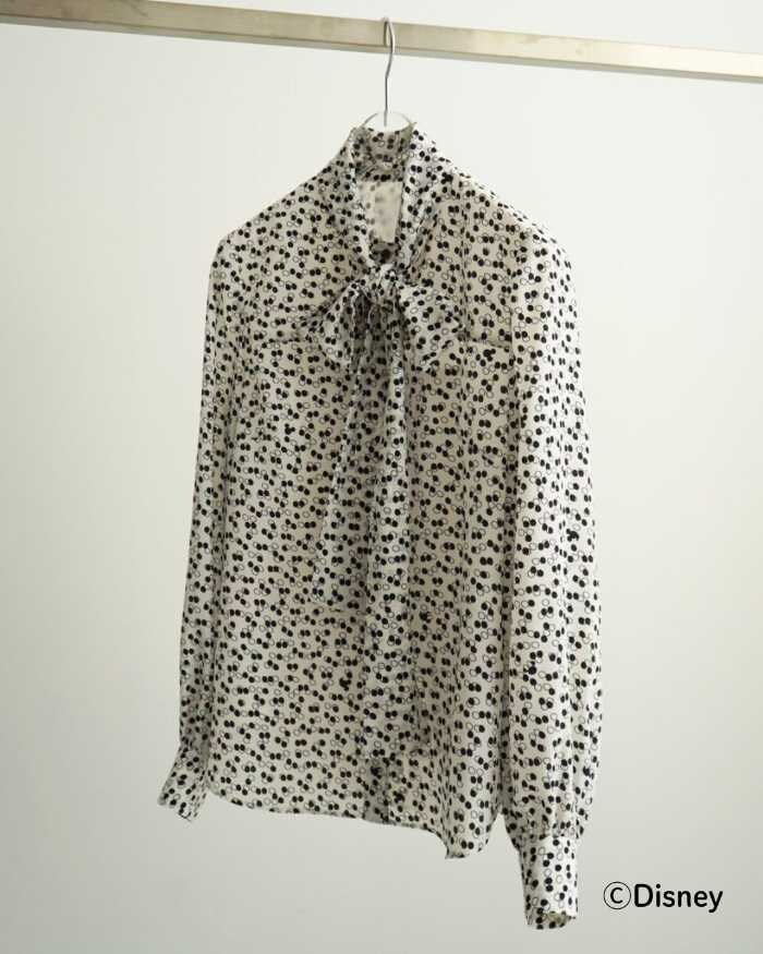 やわらかなデシン素材に隠れミッキー&ミニーが散りばめられたブラウス。取り外し可能なボウタイ付きで、多彩なアレンジが可能。