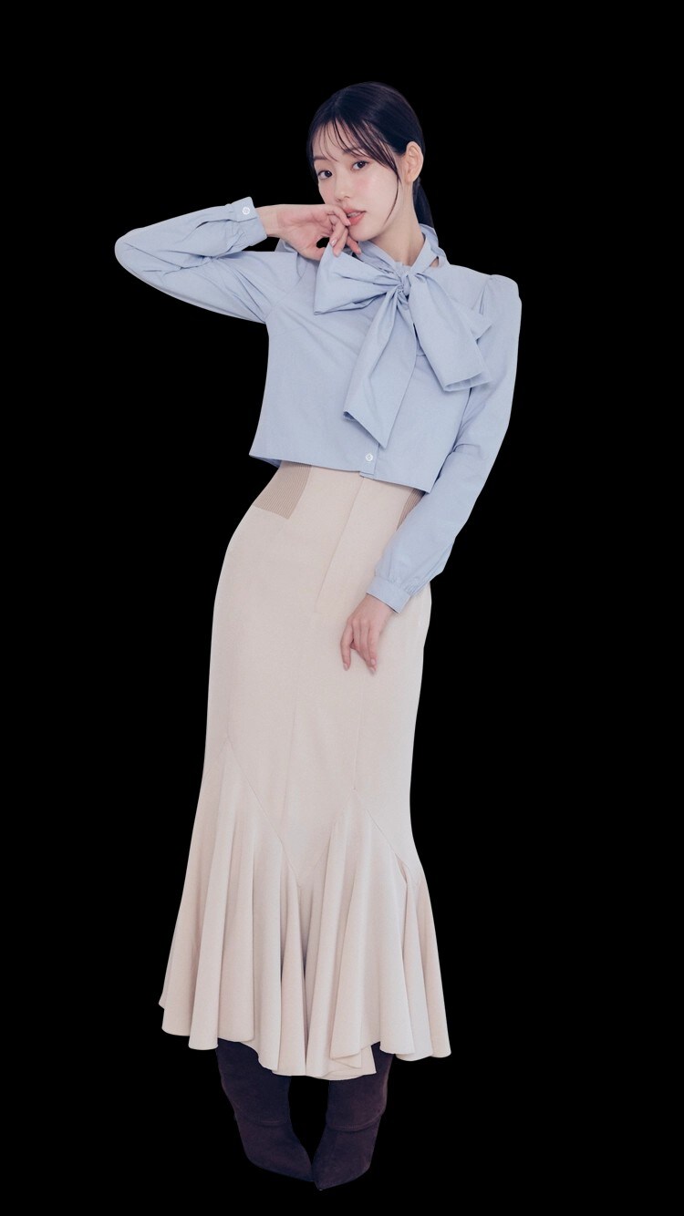 オフィス界隈なブラウス×スカートが圧倒的大人っぽ。可愛さが出やすいリボンはボウタイで取り入れるのが、メンズを惹きつける優秀テク。強めなブーツで、遊び心もプラス。