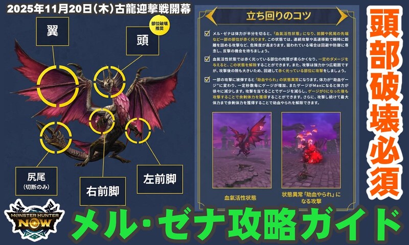 ⌇⌇モンハンNow Hunting Tips⌇⌇ ⠀⠀⠀⠀#メル・ゼナ 編体力が徐々に減少する「劫血やられ」の状態異常に注意⚠️メル・ゼナが血氣活性状態になったら、赤く光っている部位に攻撃して、解除しましょうぜひ投稿をブックマークして討伐にお役立てください#モンハンNow pic.twitter.com/WICGCKEQyQ— モンスターハンターNow 公式 (@mh_now) November 16, 2025