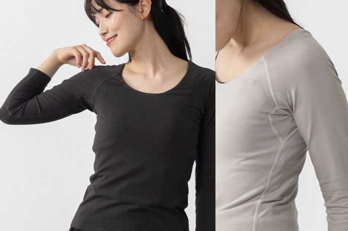 KEYUCAの「あたたかインナー」シリーズに新登場した「H 保湿Uネック発熱綿混あたたかインナー8分袖」は、発熱綿混素材が汗を吸収して熱に変え、じんわり暖かい着心地を叶えるアイテム。