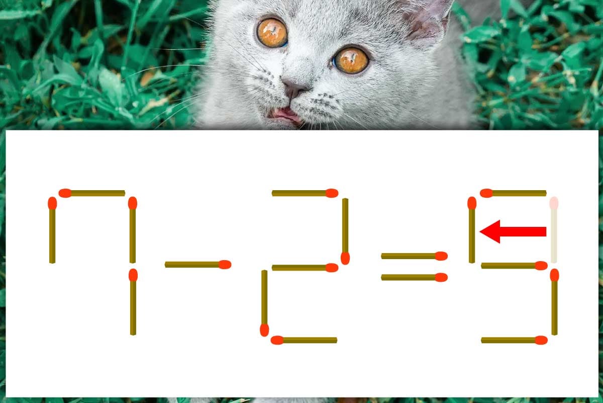 「3」のマッチ棒を1本移動させて「5」を作り、「7-2=5」にする。※解答は複数ある場合があります。