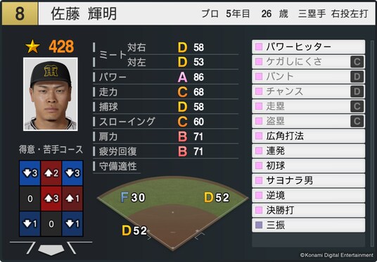 40本塁打・102打点で打撃2冠に輝き、阪神タイガースのリーグ優勝に貢献した佐藤輝明選手の能力値が大幅にアップ。『プロスピ2025』ではスローイングが「D50→C60」、サードの守備適性も「E49→D52」になるなど、守備面の能力が大幅にアップ。パワーは、『プロスピ2025』『パワプロ2025』ともにアップし、搭載しているNPBの現役選手としては、最高値のパワーとなりました(※)。