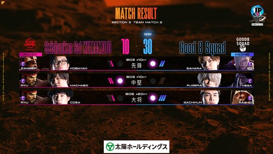 大将戦は、「cosa選手」のリュウと「ガチくん選手」のラシードに。「cosa選手」が早々に第1BATTLEを先取するも、その後は「ガチくん」の代名詞とも言える、ラシードのスーパーアーツLv.2「イウサール」を主軸とした戦いに終始苦しめられる。そのまま3連続でBATTLEを勝利した「ガチくん選手」が勝利した。