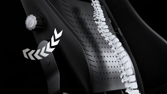 背もたれ内部に4方向調整可能な内蔵式ランバーサポートを搭載。独立型クッションではなく、背もたれ全体で支える設計により、背骨のS字ラインに沿ってフィットします。姿勢や動きに合わせて腰を支え続け、長時間の作業でも理想的な姿勢をキープします。