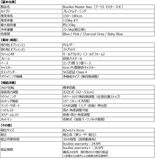 人間工学に基づいたゲーミング&オフィスチェアの開発・製造に特化した株式会社ブーリス(本社:福岡県糸島市、以下「ブーリス」)は、日本人の体型や生活習慣に合わせて開発した日本限定モデル「Boulies Master Neo(ブーリス マスター ネオ)」を、2025年11月17日(月)11:00より公式オンラインストア及び公式Amazonストアにて先行予約受付を開始し、11月26日(水)午前10:00から正式発売いたします。
