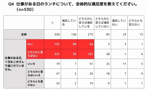 続いて“ごきげん”と“ランチ”の関係を考察していくことに。仕事がある日に「1日をごきげんに過ごせている人」のうち、「ランチの満足度が高い人」の割合は88.7%と高く、「満足度の低い人」はわずか9.4%。一方で「1日をごきげんに過ごせていない人」では、「ランチの満足度が高い人」は47.6%にとどまり、「満足度の低い人」は48.4%まで増加した。この結果から、ランチの満足度が高い人ほど、1日をごきげんに過ごす傾向がうかがえる。ランチが、仕事がある日の気分を左右する重要な要素となっている可能性がありそうだ。
