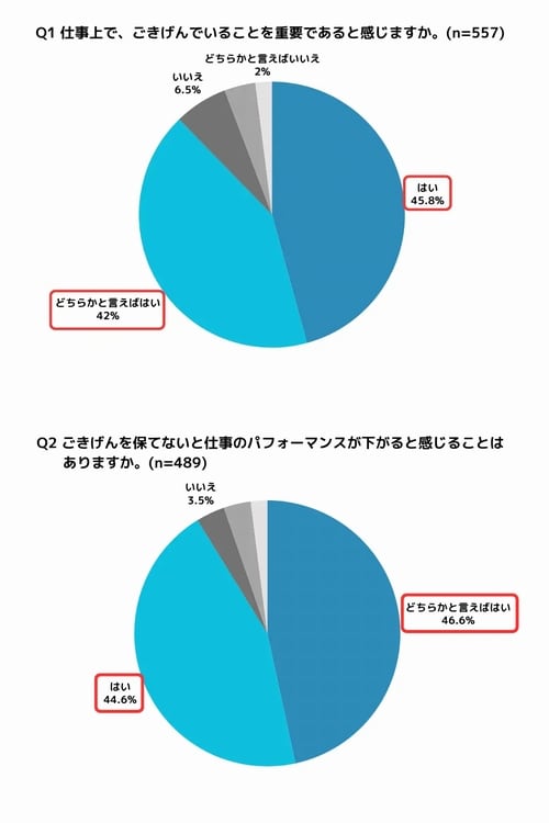 調査ではまず、「仕事上で“ごきげん”でいることを重要であると感じますか?」と質問。その結果、「はい」(45.8%)、「どちらかと言えばはい」(42.0%)を合わせた87.8%が「ごきげんでいることが重要である」と感じていることがわかった。また、「ごきげんを保てないと仕事のパフォーマンスが下がる」と回答した人は91.2%に上り、感情が仕事を左右すると実感している人が非常に多いようだ。