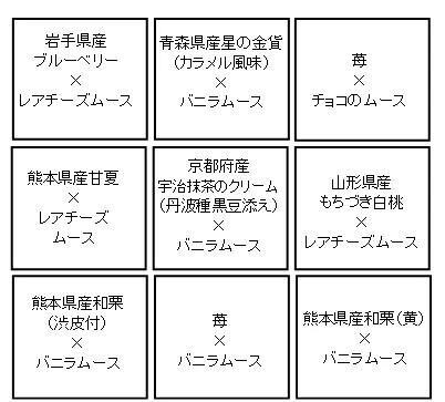 さまざまな組み合わせのムースケーキが9種類。取り分けながら楽しめるので、家族団らんのひとときにぴったりです。