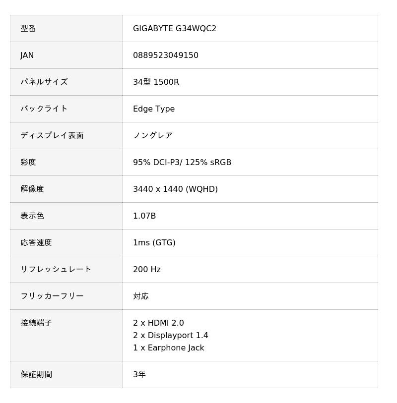 GIGABYTE G34WQC2 | GIGABYTE(ギガバイト) 34インチ WQHD(3440x1440) 曲面 液晶ゲーミングディスプレイ/モニター
