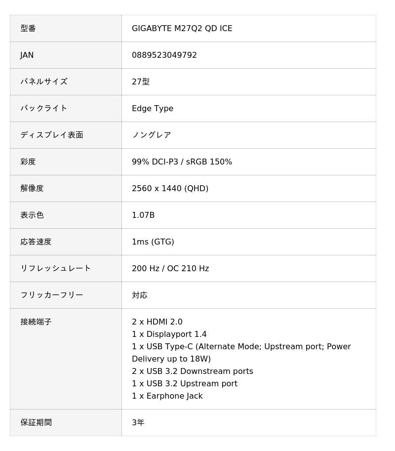GIGABYTE M27Q2 QD ICE | GIGABYTE(ギガバイト) 27インチ WQHD (2560x1440) 液晶ゲーミングディスプレイ/モニター ホワイトカラー