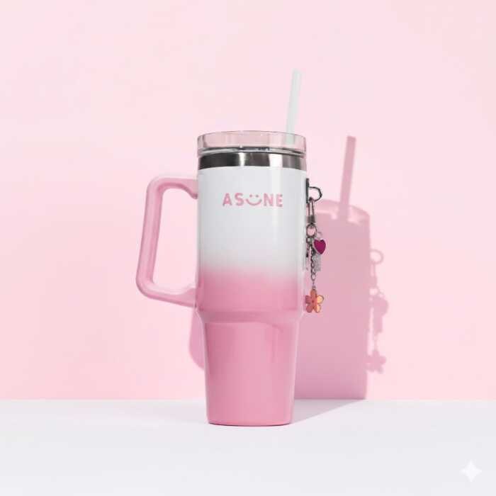 淡いピンク×ホワイトのグラデーションが可愛いステンレス製で、実容量は887ml。高さ約24cm、口径約7cmの大きめサイズで、ストローも付属しています。