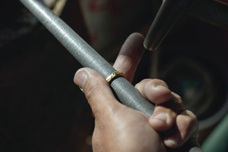 それは、硬さが異なる18金と純プラチナを接着するというもの。性質が異なる水と油のような2種の金属は、製作工程においても全く言うことを聞かず、コントロールできるのは職人の坂入大士さんがこれまでに積み上げてきたノウハウと技術あってこそ。すべては「市松」を求める人が選べるバリエーションを増やすため。