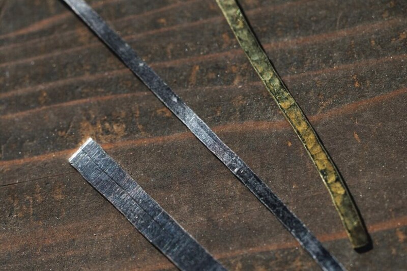 2.木槌で形を整えたあと、小さなシルバーをロウ代わりに金属同士を接着させる。