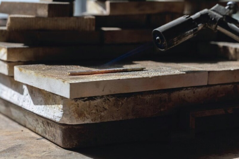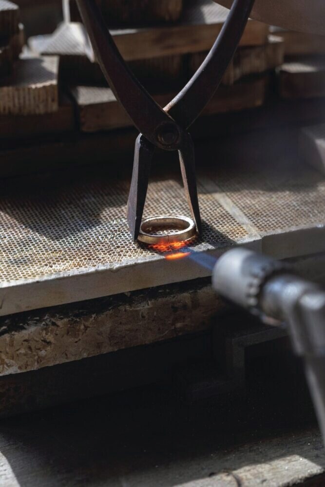 3.しっかりロウを溶かして接着。この段階ではそれぞれの金属がうまく噛み合わないため、木槌を使って形を調整していく。