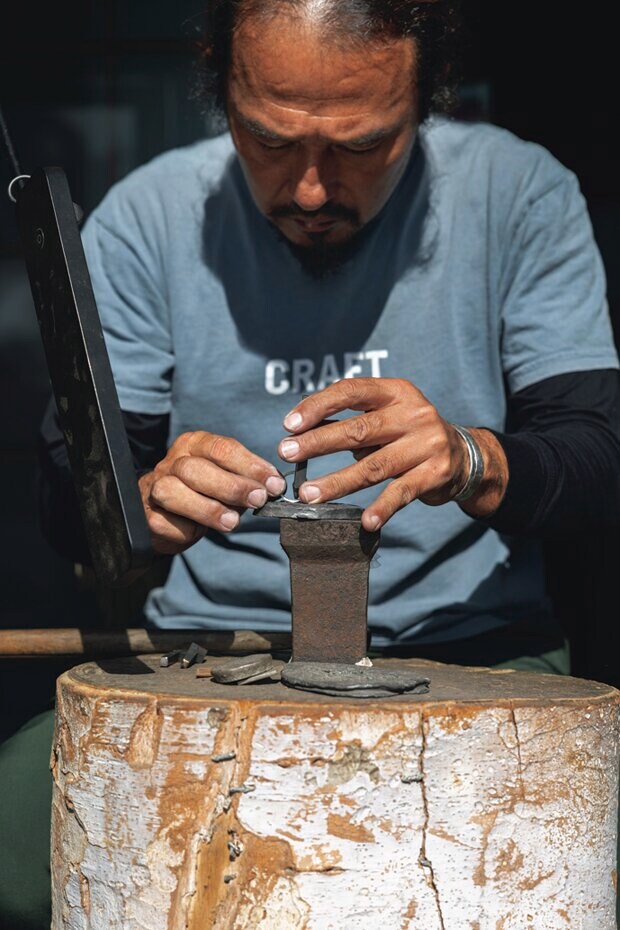 6.「市松」ならではの鎚目を付けていく工程。このタイミングや、仕上げの刻印入れのタイミングで割れてしまうこともあるという。