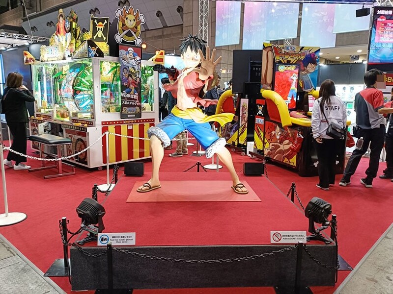 「ワンピース」を題材にしたアーケードゲームと「モンキー・D・ルフィ」等身大オブジェクト(バンダイナムコエクスペリエンス)