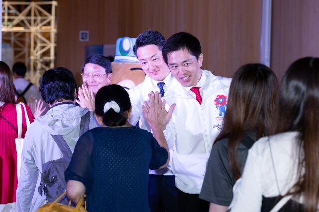 「大阪ヘルスケアパビリオン」へ入館する“最後の来館者”を、吉村知事、横山市長、西澤館長の3名がハイタッチでお出迎え。