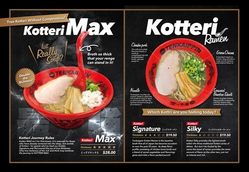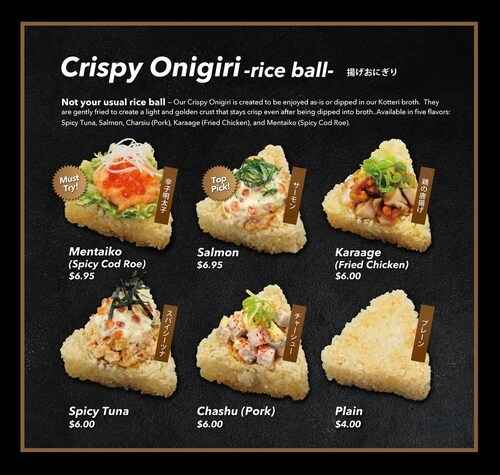 「天下一品 LA本店」では「Kotteri Max」「Kotteri Signature」「Kotteri Silky」の3種類の“KOTTERI”を用意。また、“飲むスープ”ではなく“食べるスープ”がコンセプトの“KOTTERI”スープをディップして食べる新感覚おにぎり「Crispy Onigiri」(揚げおにぎり)などLA本店限定メニューも用意する。