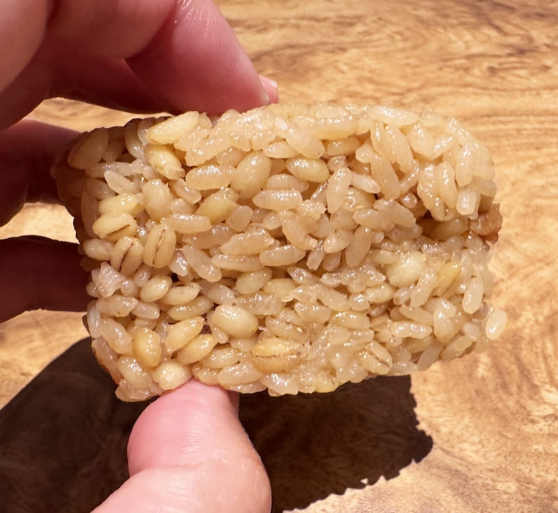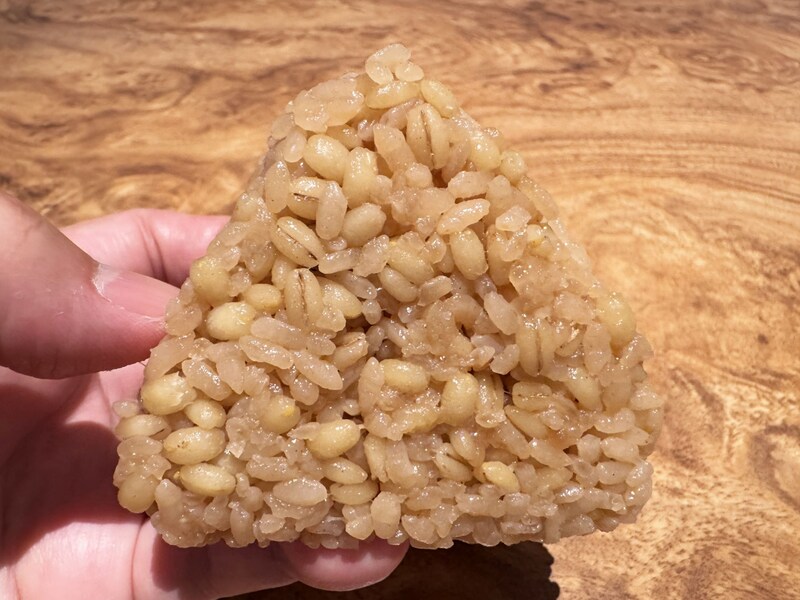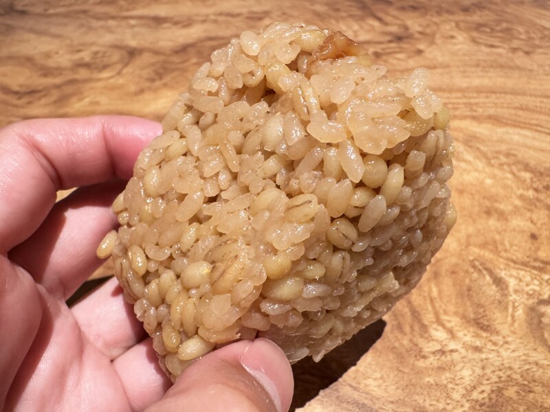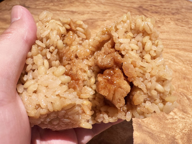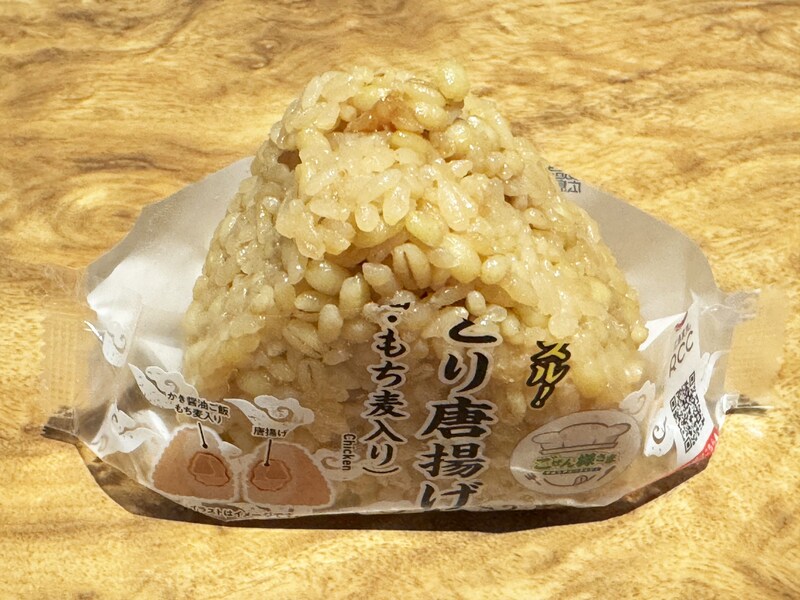 おむすびにガッツリ系の唐揚げがドスン! と入っているのだけれど、豪快に思えて、けっこうベースのテイストが繊細。かき醤油ともち麦を使ってて、味と食感と栄養素にもイイ感じに寄与したレシピで作られている。つまりこれ、ワイルドでありながら優しい。