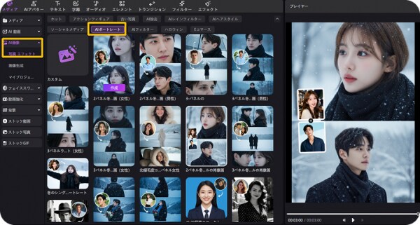 Step2. 表示される 「AIポートレート」 カテゴリから好みの雪系テンプレートを選ぶ。