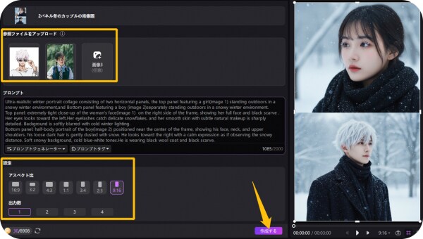 さらに、生成した写真を活用すれば、後から ショート動画への応用 も可能。静止画だけでなく、SNS向けの冬演出コンテンツ制作にも幅広く対応できます。