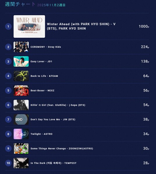 また、同日のチャート投票では、V(BTS)とPARK HYO SHINによる「Winter Ahead (with PARK HYO SHIN)」が1位を獲得し、番組内でも紹介されました。