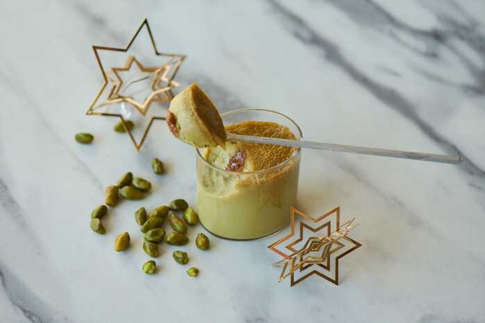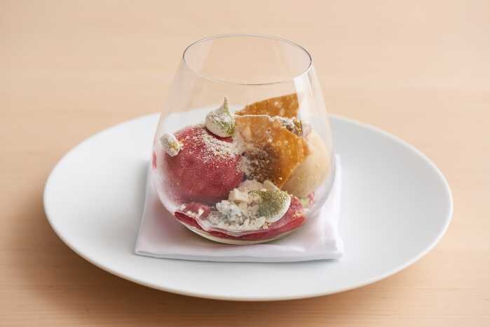 ピスタチオアイスやラズベリーソルベ、抹茶のブリュレなどが重なる美しい一品で、心も満たされる贅沢な時間を楽しめます。