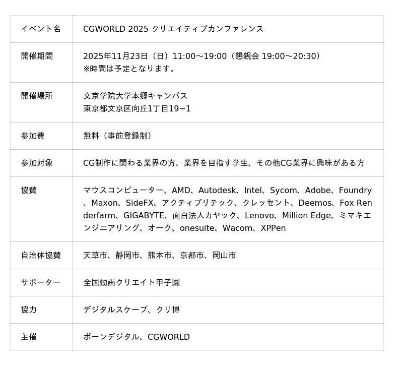 株式会社ボーンデジタル(本社:東京都千代田区、CEO:新和也、URL:https://www.borndigital.co.jp/)は11月23日(日)にCG・映像クリエイターのためのカンファレンスイベント『CGWORLD 2025 クリエイティブカンファレンス』を文京学院大学で開催いたします。