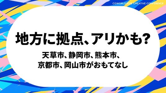 今、地方行政の積極的な誘致活動を背景に、新拠点を検討するコンテンツ企業やクリエイターが増えています。スタジオの地方進出やU・Iターンをお考えの方、各自治体の担当者がお土産を持ってお待ちしています。ぜひお気軽にお立ち寄りください!