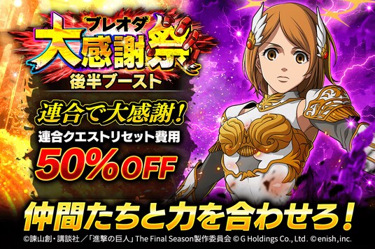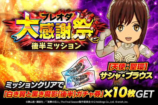 株式会社enish(本社:東京都港区、代表取締役社長:安徳 孝平、以下enish)は、アニメ『進撃の巨人』のスマートフォンゲーム最新作「進撃の巨人Brave Order」にて、2025年11月18日(火)より、ブレオダ大感謝祭後半を開催!今ならガチャなどに使用できる赤輝石が最大3,000個もらえちゃう!また大感謝祭後半ミッションではサシャの特別な衣装がGET可能!その他、最新情報はゲーム公式サイト・ゲーム公式X(旧Twitter)アカウントにて随時公開して行きますので、ぜひご覧ください。