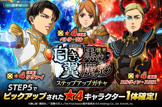 ・新登場の【天使】リヴァイ/【天使】ペトラ・ラル/【悪魔】エルヴィン・スミスがピックアップされたガチャ。