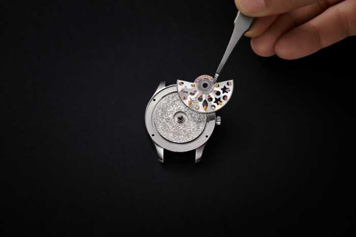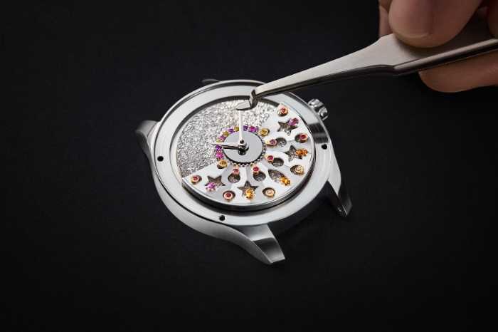 ローターは立体感を高めるために3Dで象られ、複数の透かし彫りを施したマザーオブパールのフレームを重ねることで、見た目の華やかさを引き立てています。